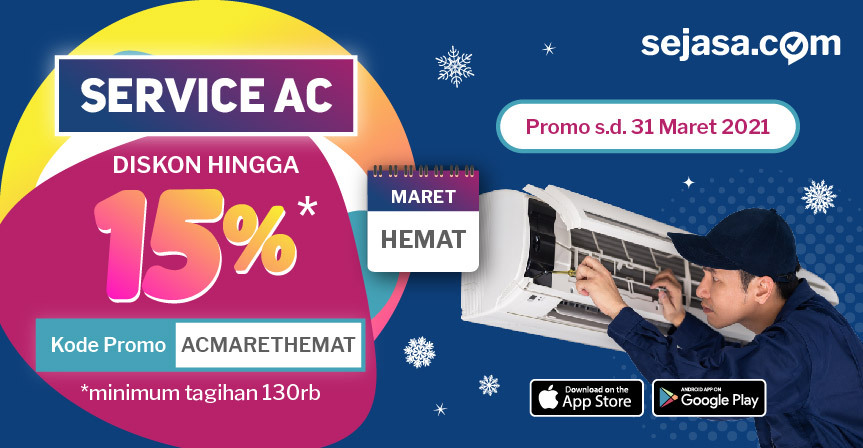 Bulan Maret ini Sejasa punya banyak promo. Salah satunya adalah Maret Hemat dengan diskon Service AC sampai 15%. Cocok untuk yang ingin menjadikan rumah dingin tapi tetap irit. Anda bisa menggunakan layanan ini untuk mengatasi berbagai masalah AC seperti AC tidak dingin, AC berisik, AC bocor, dan AC rusak. Promo ini cuma berlaku sampai akhir Maret 2021 saja! Ayo, jangan lewatkan kesempatan ini. Pesan jasa Service AC dan manfaatkan promo ini!