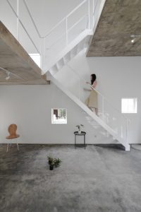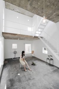 Rumah yang berukuran 4x6x6 ini terdiri dari kamar tidur, kamar mandi, ruang baca, ruang tamu terbuka, dapur, dan ruang makan. Setiap sisi rumah dicat dengan warna putih yang menciptakan kesan simple dan modern. Lantai dan atap dari rumah ini menggunakan beton ekspos sedangkan dindingnya dibuat dari bata.