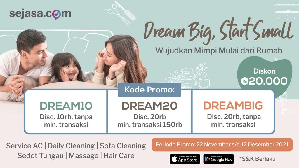 • Penggunaan kode DREAMBIG akan mendapatkan diskon Rp20.000 tanpa minimal transaksi. Berlaku untuk pelanggan baru Sejasa yang memesan layanan kategori Daily Cleaning, Massage, Sedot Tungau, dan Sofa Cleaning.