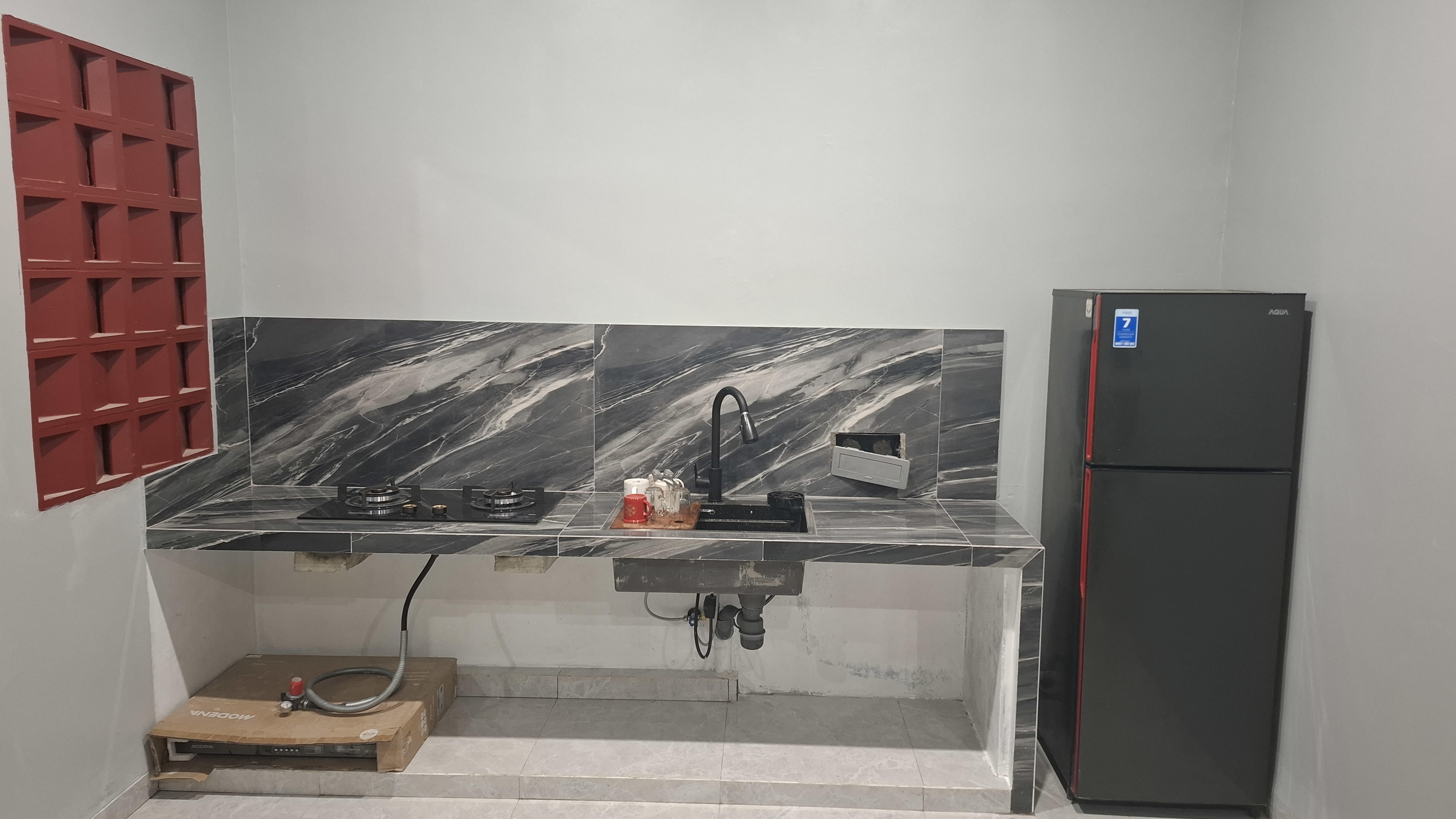 Potong lantai kitchen set, pasang keramik di bekas potongan