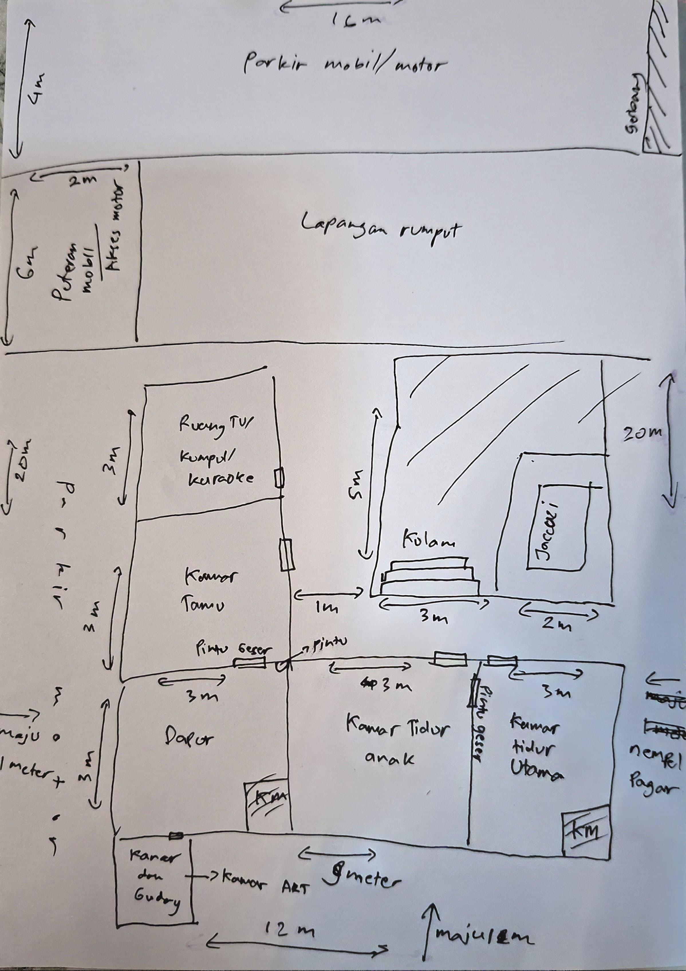 Saya ingin membangun rumah dengan konsep villa, bergaya insdustrial scandinavian dengan 3 kamar, 3 kamar mandi, 1 di dalam kamar utama, 1 di dapur, dan 1 lagi diluar untuk bilas.